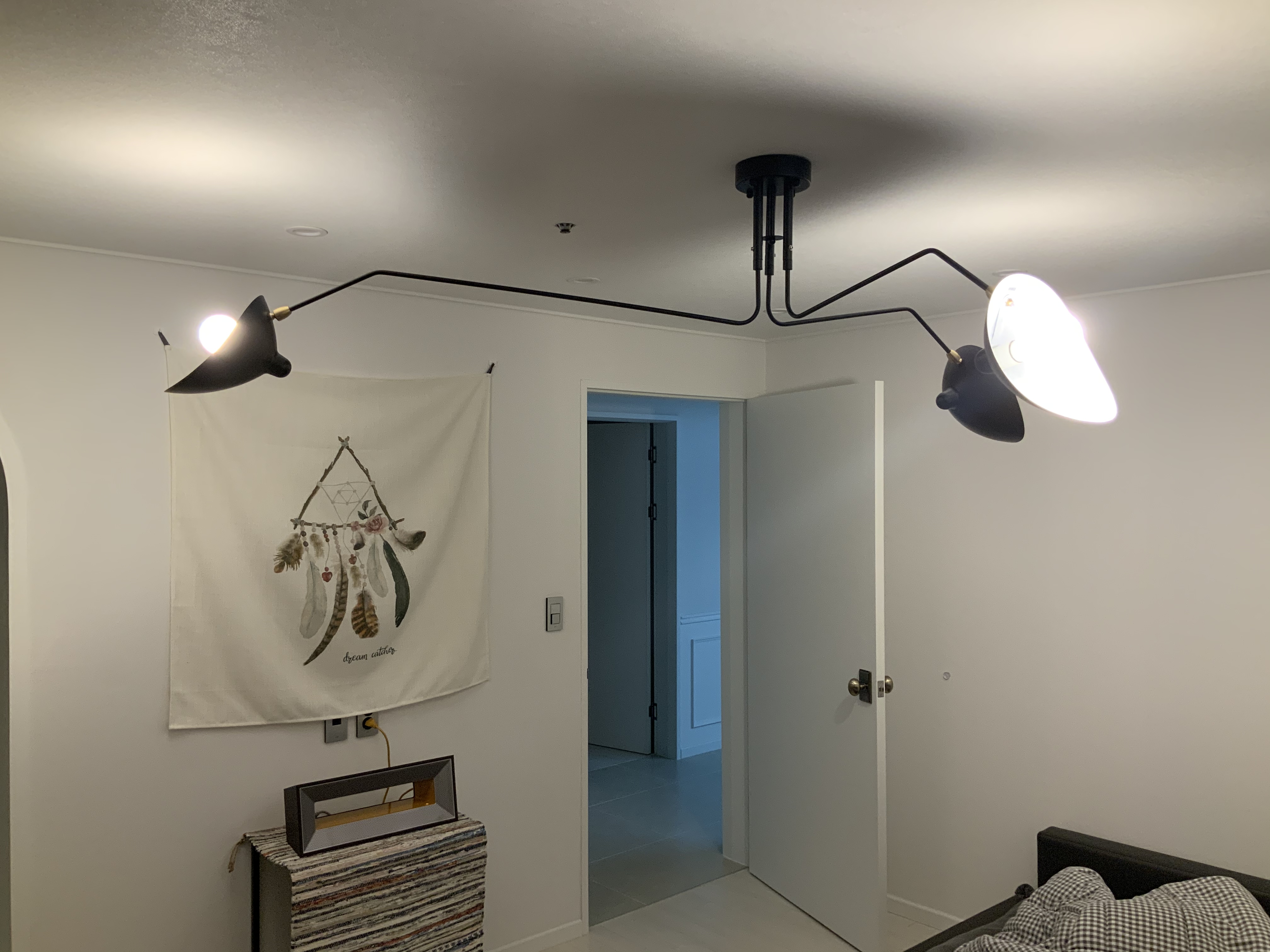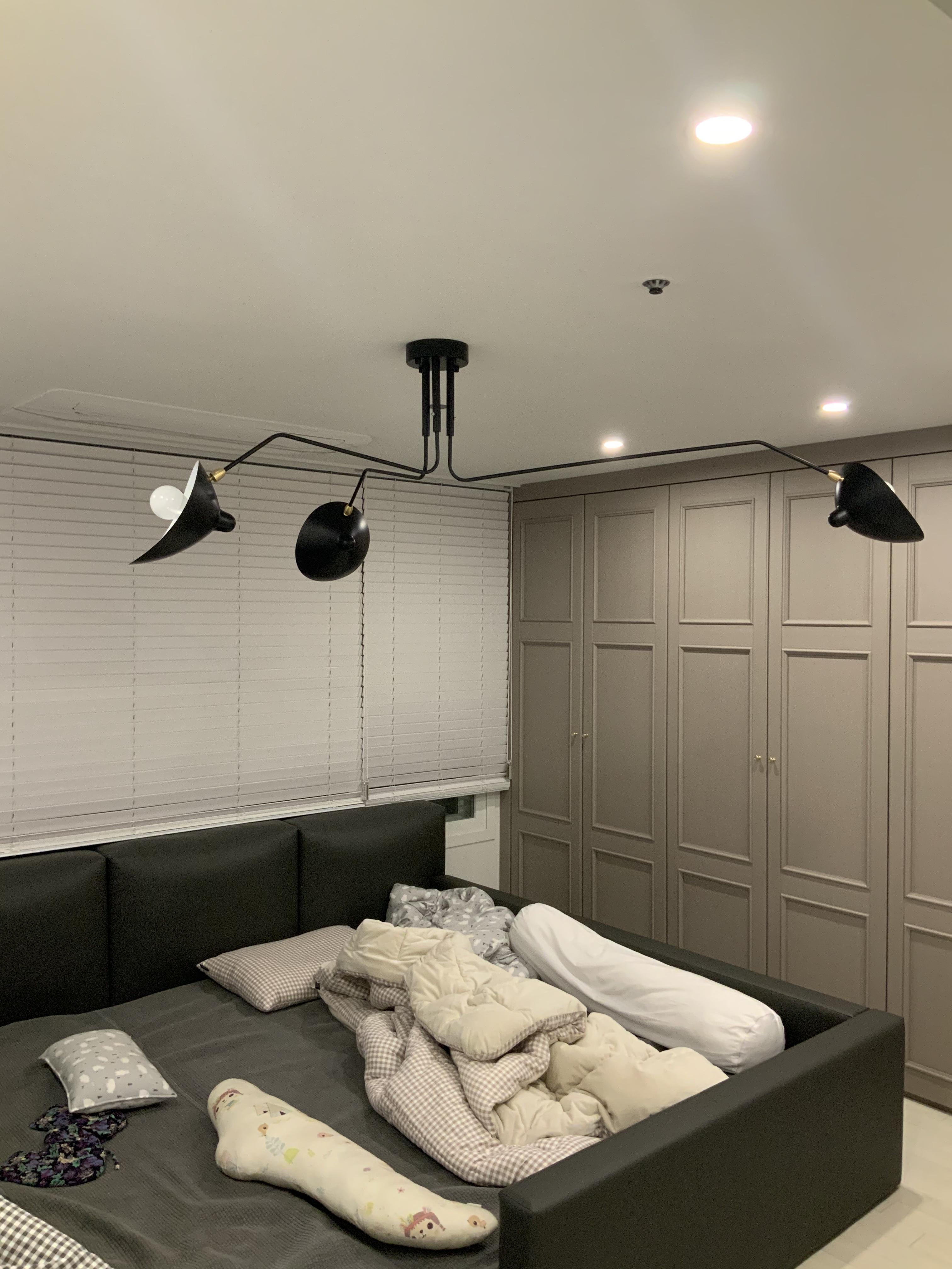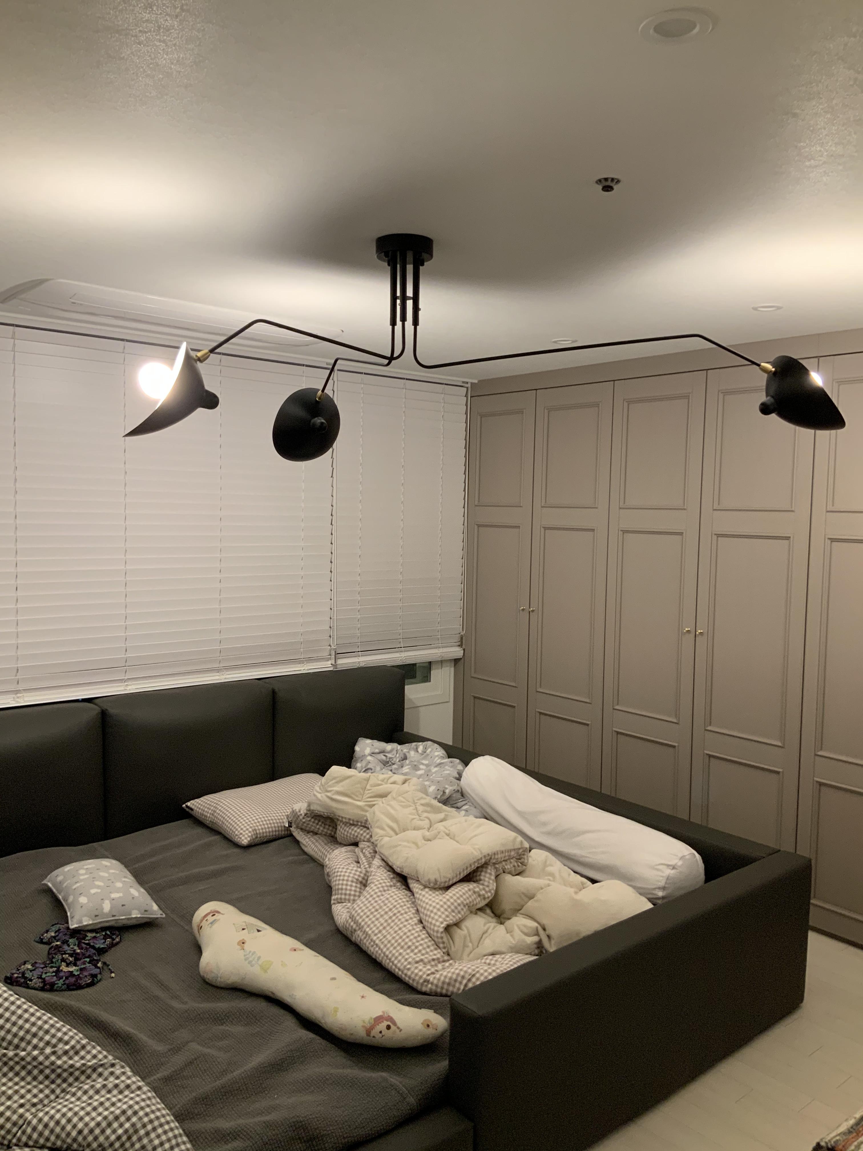 보통 집 분위기의 반 이상은 조명이 좌지우지 합니다 이번에 인테리어를 하면서 더욱 절실하게 느꼈죠 왜 200만~300만원이나 하는 조명을 사서 다는지에대해.. 어쨌든 저희집 안방의 조명은 기본적으로 주광색 매립등에 포인트조명으로 진행했습니다 매립등은 노랑이지만 흰색에 가까운 노랑이라 표현하는것이 맞겠구요 옛날집이다보니 천장의 높이가 230cm 인지라 간접등을 위하여 천장에 박스작업하기에도 높이가 너무 낮았구요 따라서 포인트등을 하기로 하였지요 안방조명을 인터넷과 sns에서 한참을 뒤졌지만 실제로 마음에 드는것이 없었어요 저희집은 저상형침대라 온가족이 침대위에서 함께 잠을자는데 조명이 너무 내려오면 머리에 닿을수 있기에 가급적이면 천장에 바싹 붙어있는 조명위주로 찾아보다보니 마음에 드는게 정말 일반적인 조명밖에는 없더라구요 특히나 요즘 면발광이 유행인지 엄청 종류가 많은데 우리집 느낌에는 아니더라구요