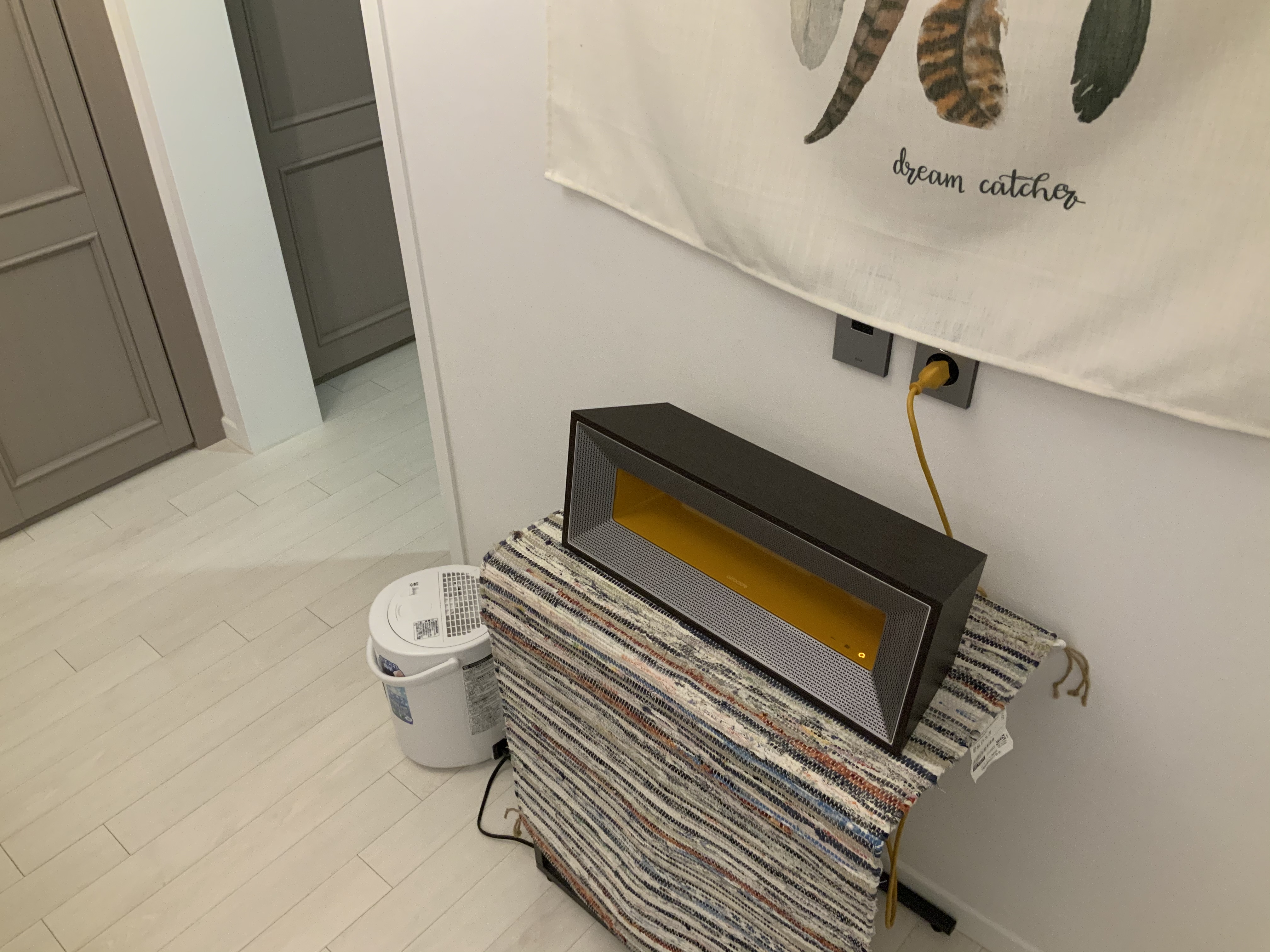 당연히 저상형침대위에서면 조명에 머리가 닿습니다 침대에 올라갈때 신경써야 합니다 ;)) 그래도 화이트 우드블라인드와 검정의 조명은 제법 어울리네요 (참고로 저희집 안방 공기는 공기살균방식인 에어로사이드 제품을 사용하고 있습니다 미국에서 직구한 제품으로 가격은 50만원 정도였으며 나사 에서 개발된 기술이 들어간 제품으로 유명하지요 일반적인 필터방식의 공기청정기와 함께 사용하면 효과가 매우 좋다고 하네요)