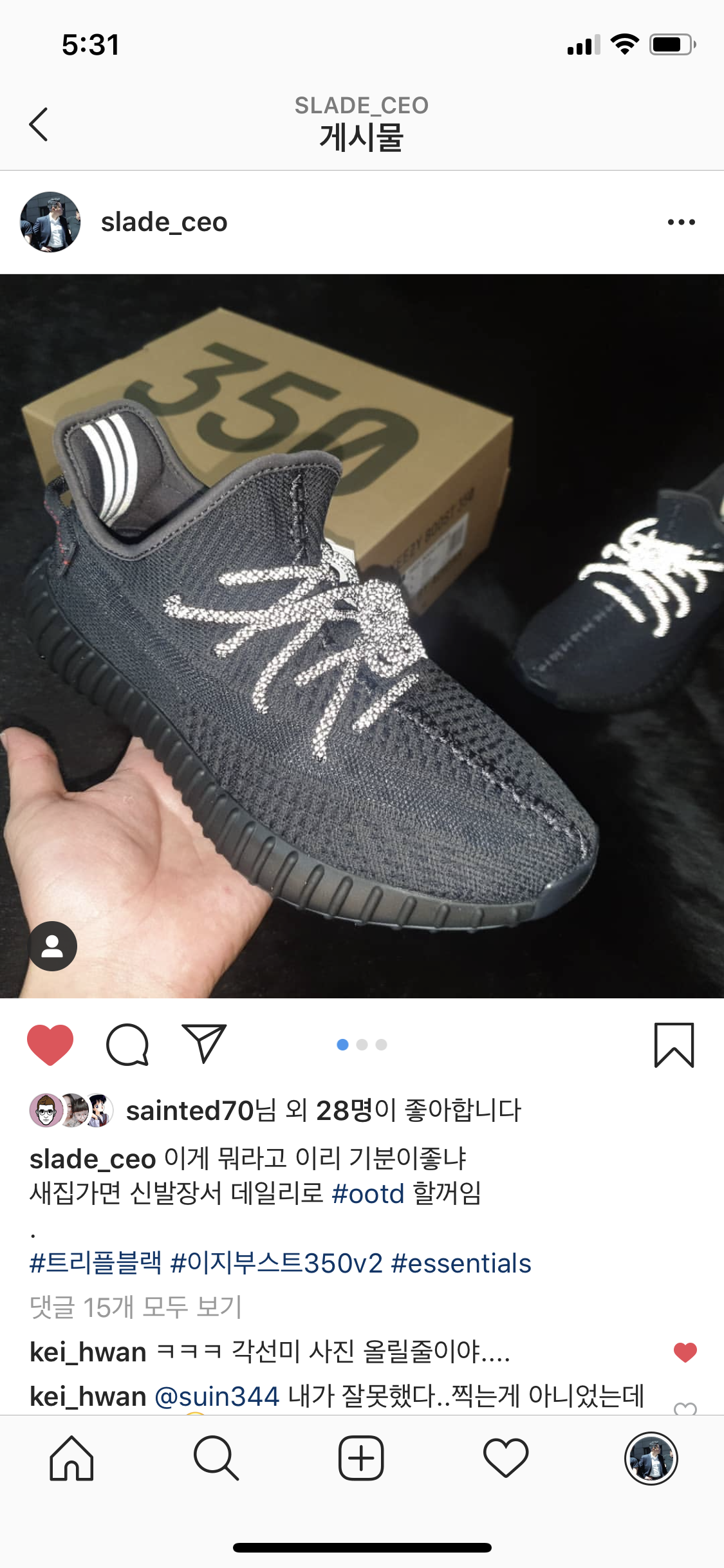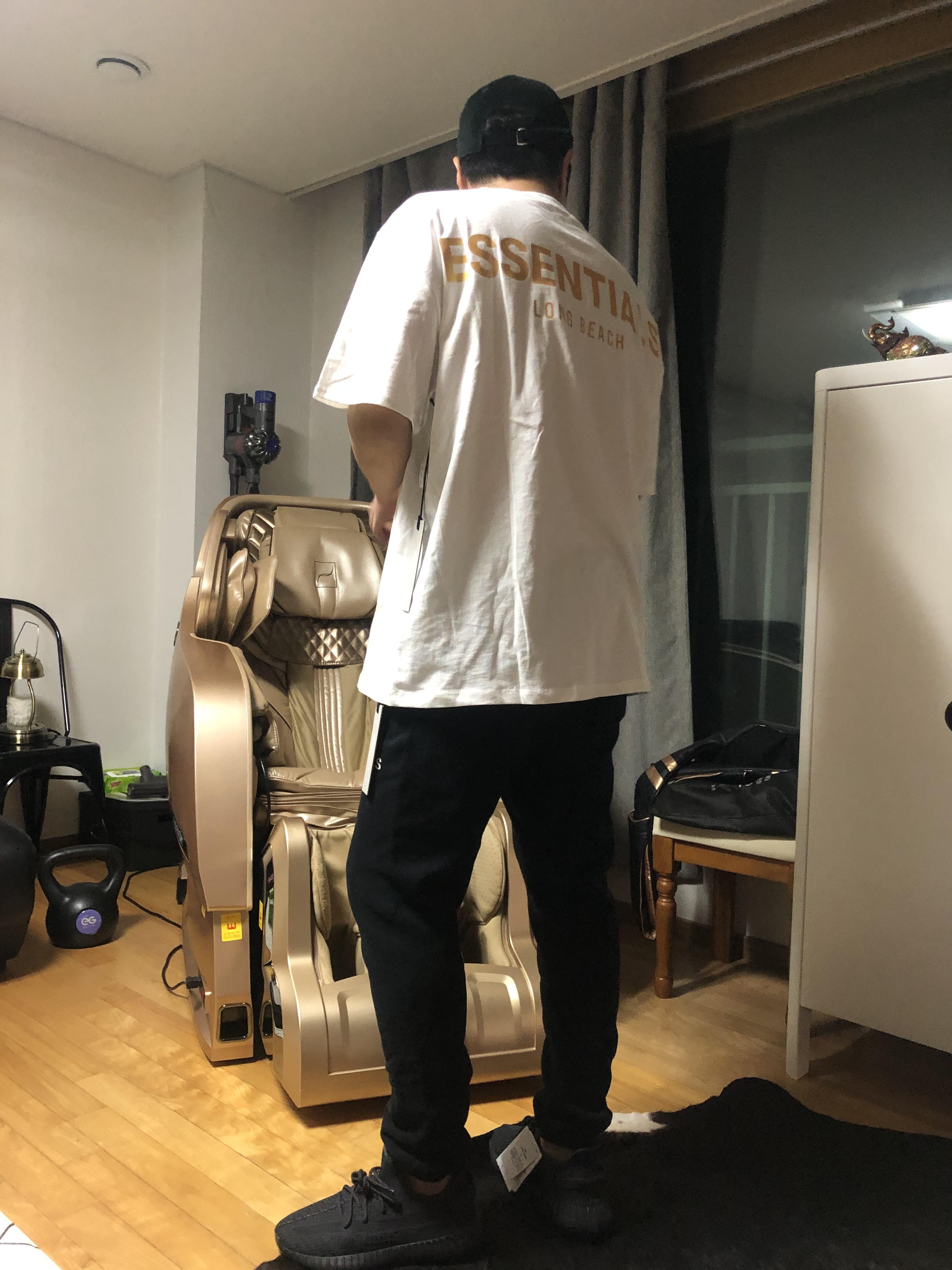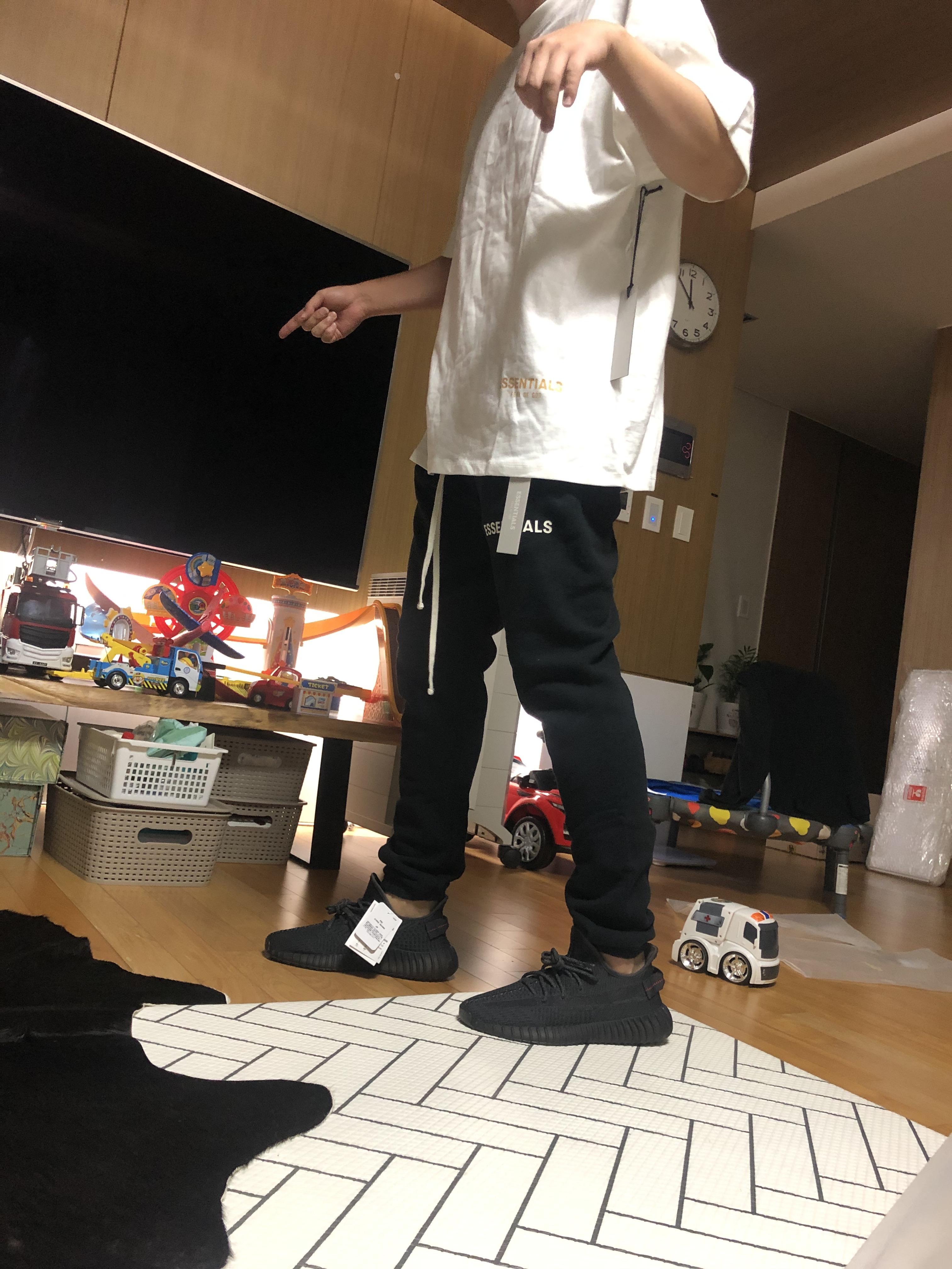 그나마 피오갓보다 에센셜 팬츠의 길이는 조금 인간적이다 (물론 가격도 1/5수준) 역시 허리의 긴 끈은 서브브랜드라도 fear of god 의 피가흐른다는것을 보여준다 재질은 면재질인데 안쪽에 기모처리 비슷하게 되어있는데 상품성이 가격만큼 좋지는 않다 (처음에 빨지않고 입었는데 땀을 흘리고 옷을 벗으니 온몸에 기모가 붙었고, 옷 조심히 입는편임에도 긴 팬츠는 두번정도 입으니 부푸레기가 발생하기 시작하고, 한달정도 땀 좀 흘리고 외부활동 많이하니 황변현상이 쉽게 발생함) 운동화는 이번에 발매한 아디다스 이지부스트350v2 트리플블랙 모델로 정가 27만정도하며 (현재 피가붙어 50만정도 하는듯) 바람이 숭숭들어오며 착화감이 겁나 편하여 최근 전투화(매일신는신발) 로 사용중이다