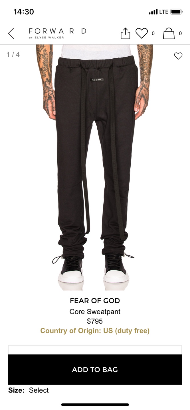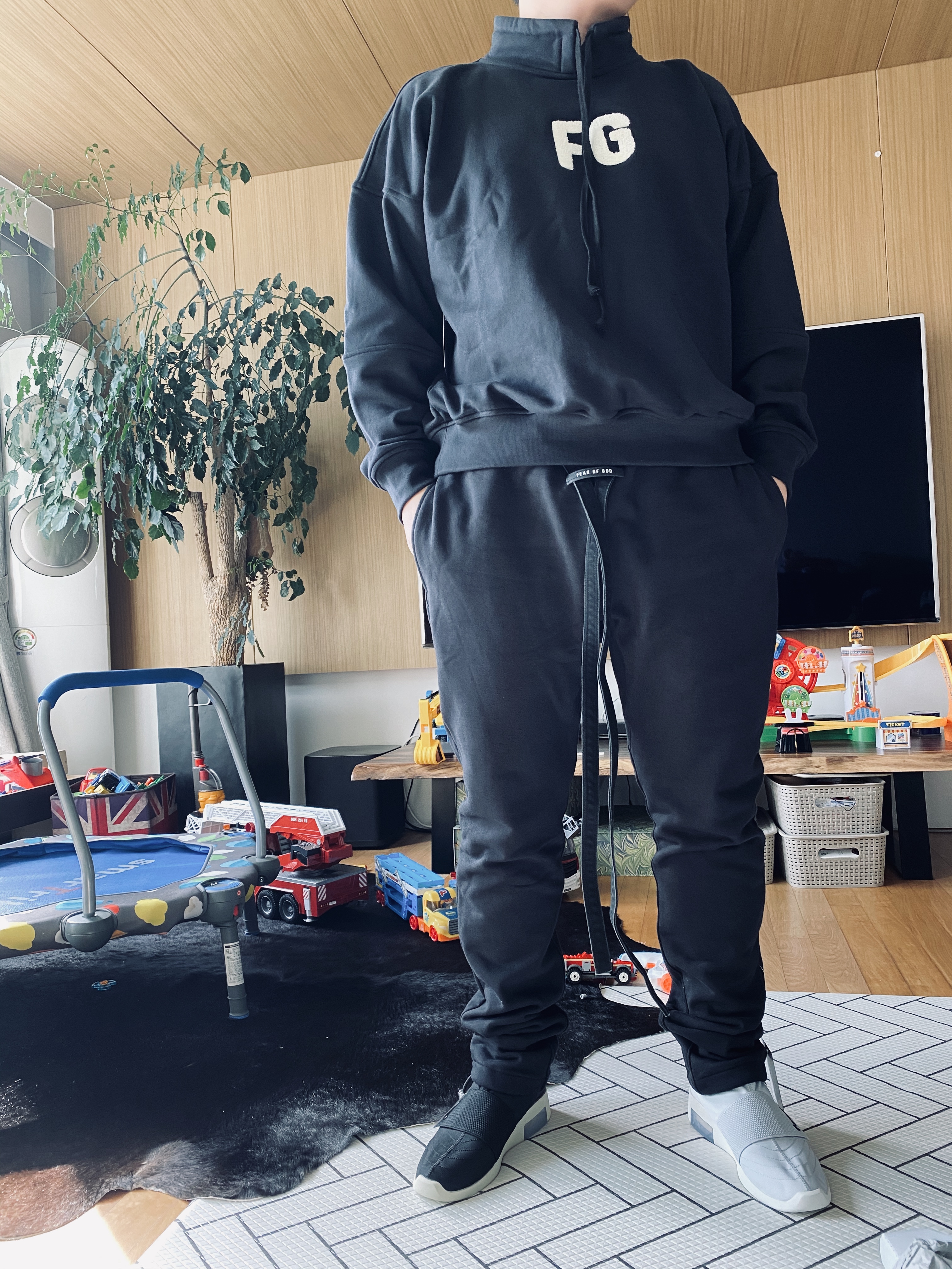 위에서 언급한대로 176/80 은 절라 구리다 독자가 내 신체스펙이라면 거듭 절대 사지마라 원래 바지하단주름 모델사진처럼 생기게해서 입는것이라해도 176cm 에는 절대 저느낌 안나온다 심지어 계단올라갈때 시그니쳐 끈 밟히고, 화장실에서 오줌눌때 변기바닥에 끈 닿을락말락하고, 차에 올라탈때 끈 밟혀서 바지 내려간다 실내에 들어오면 꼭 하단의 고무스트링을 줄여줘야한다 아니라면 백만원짜리 바지로 온 바닥을 청소하고 다닌다 이쯤에서 fog essentials 를 이야기해보자면