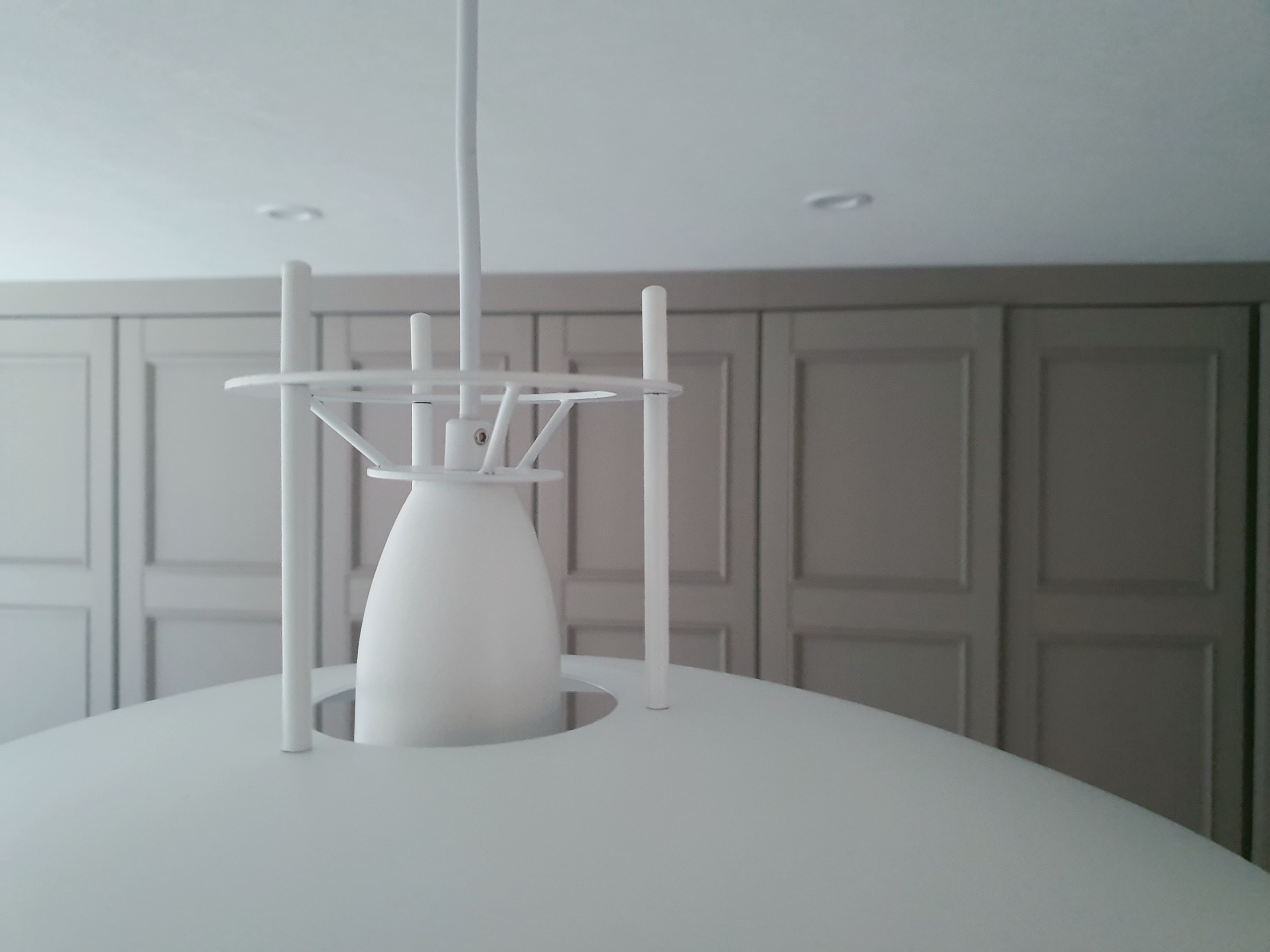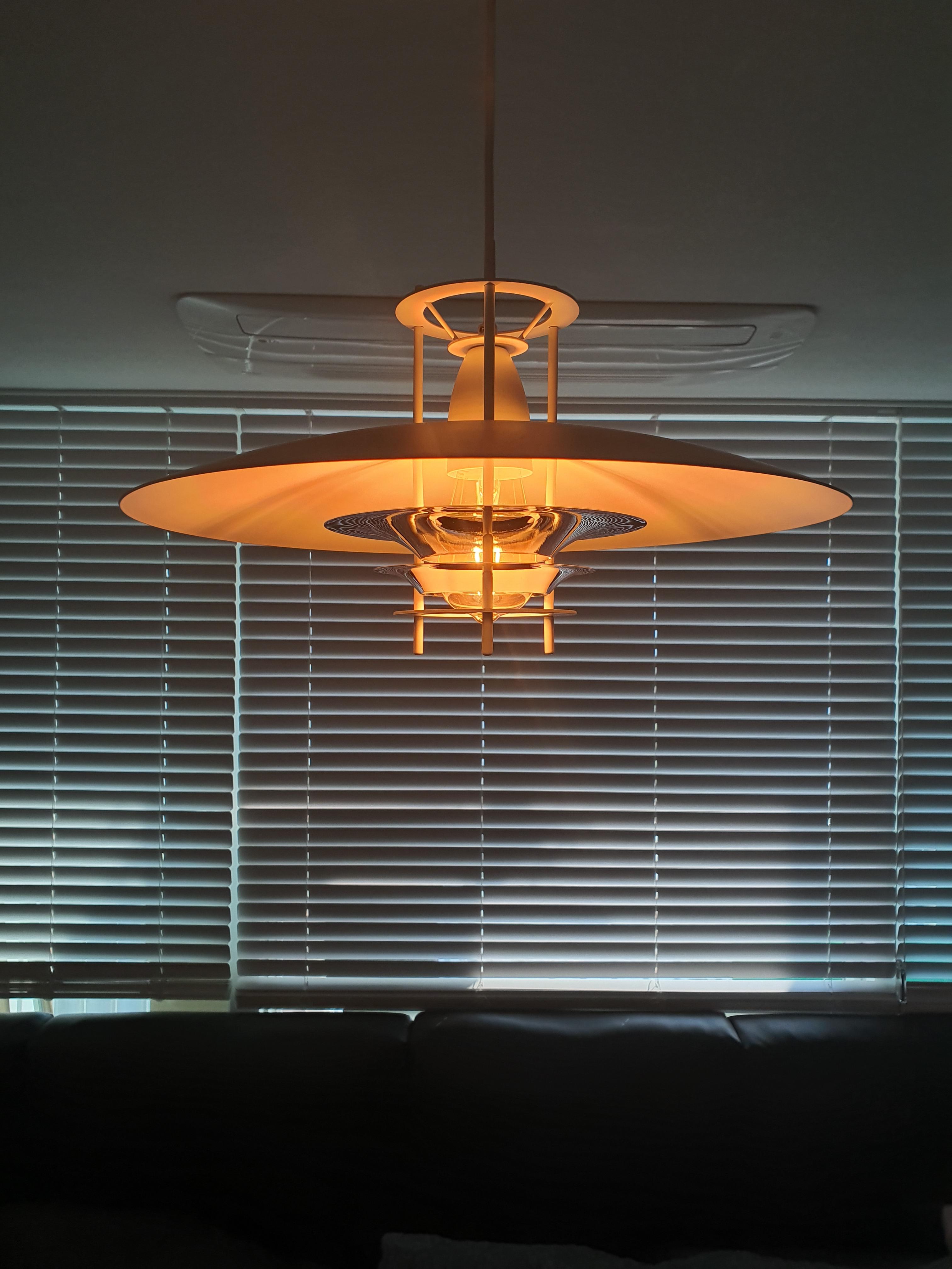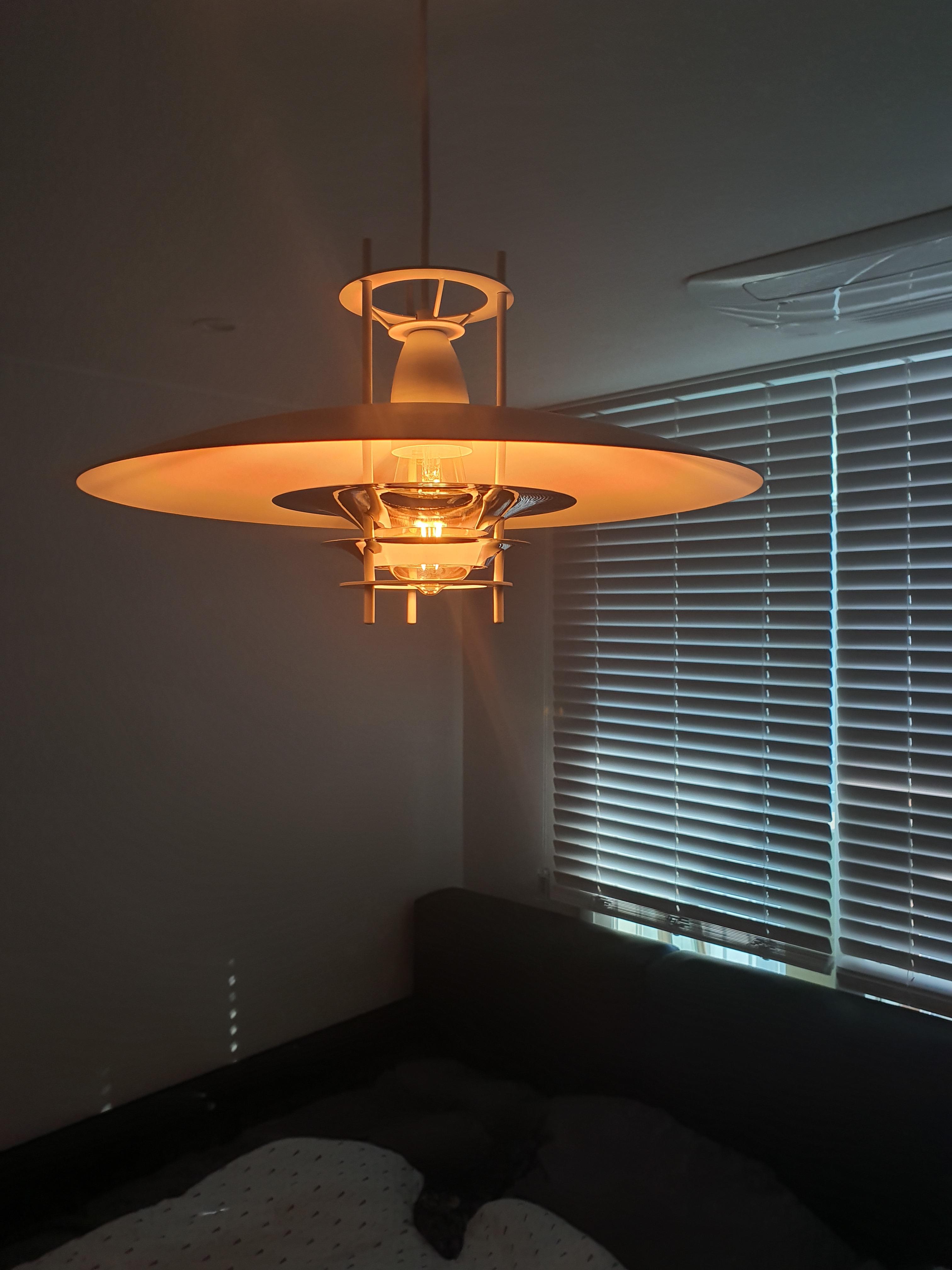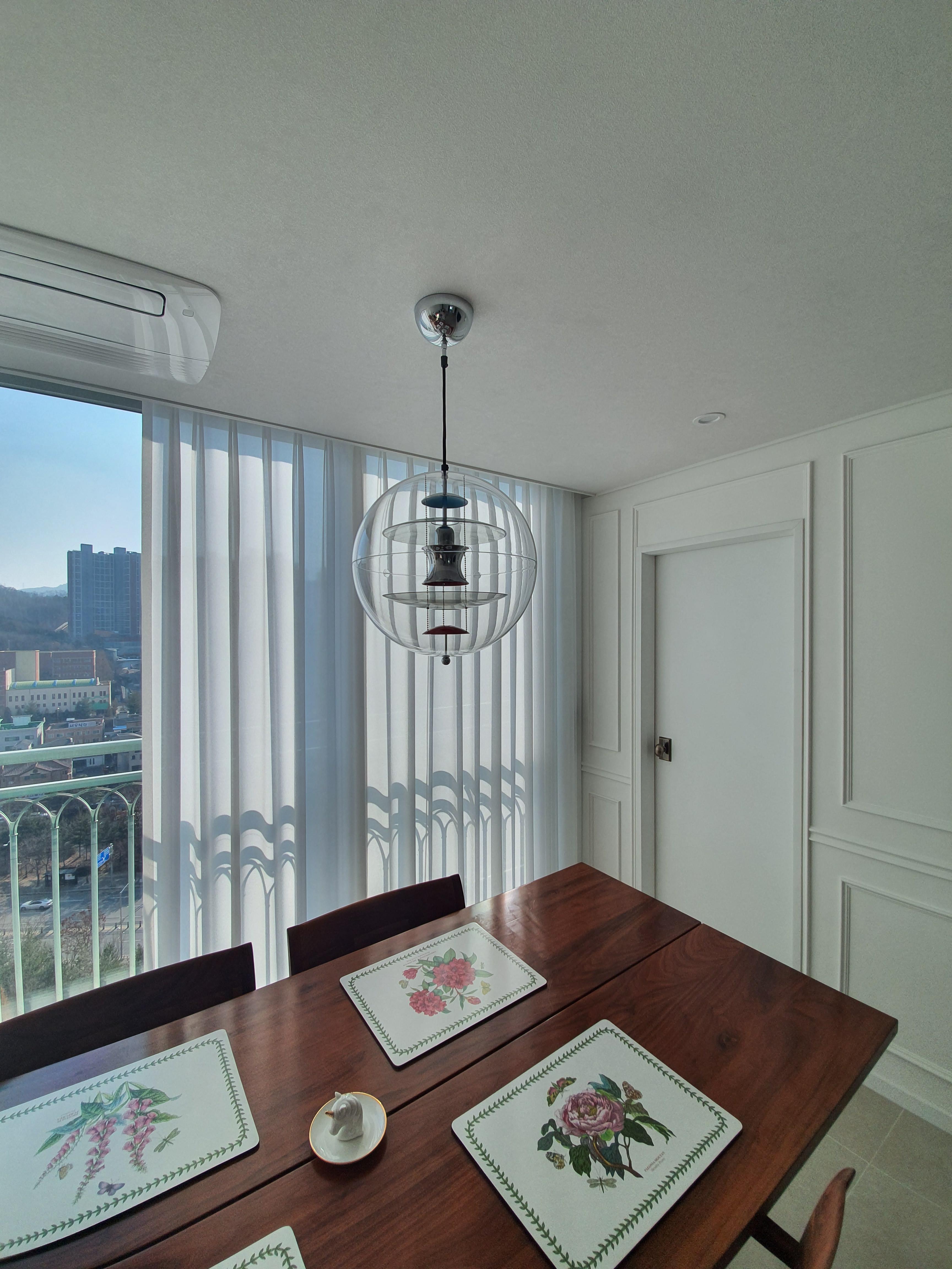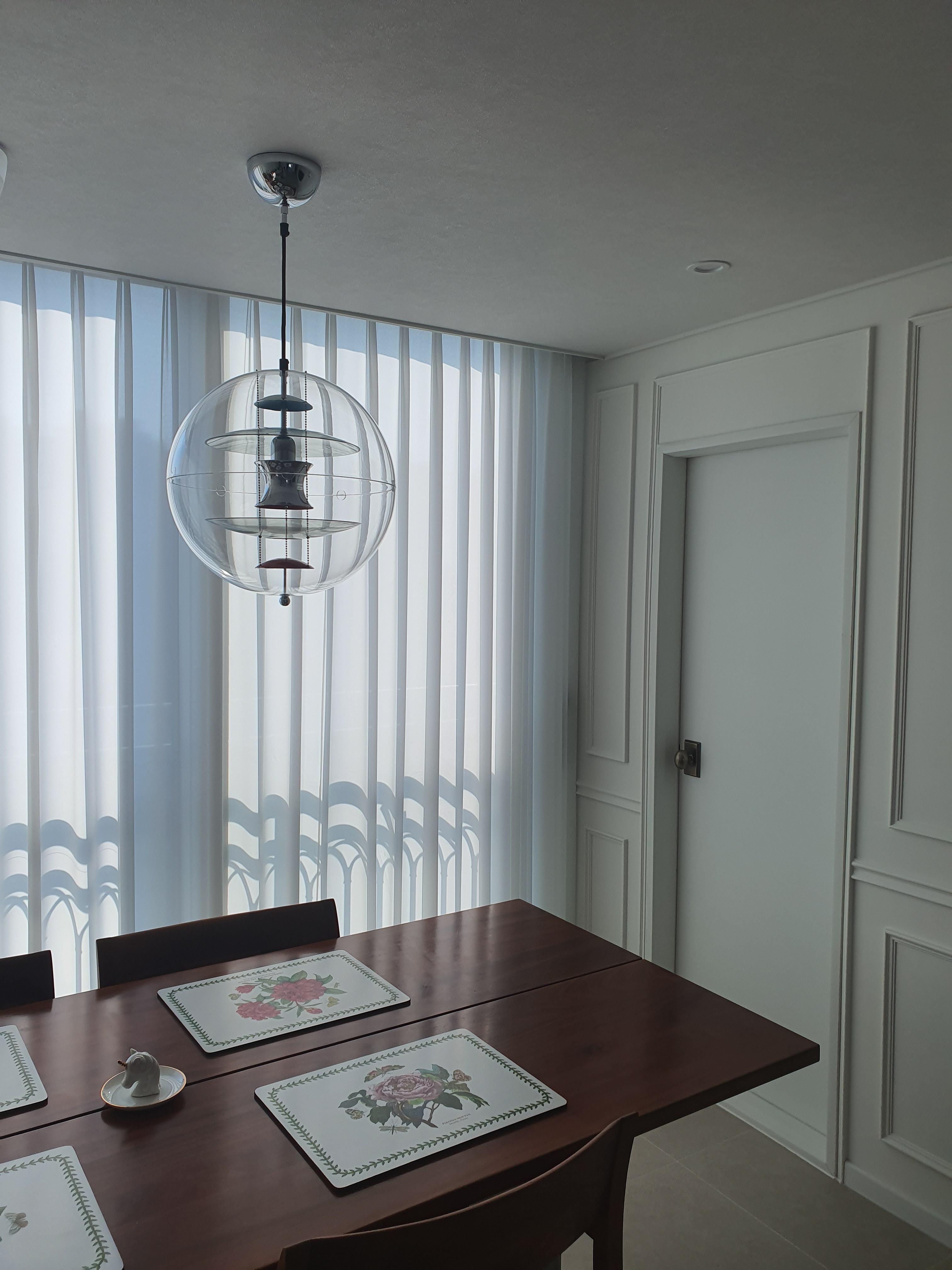 거실에 설치한 베르판은 펜던트 조명이기에 천장에서 내려서 설치하는데 통상 성인 눈높이 또는 눈높이보다 살짝 높은것이 이쁘고 여러개보다는 하나로 포인트를 주는것이 좋다 보통 식탁의 포인트 조명으로 많이 사용하는데 식탁높이를 기준으로 80~90cm 띄우고 설치하면 식탁 이용에 가장 이상적이다