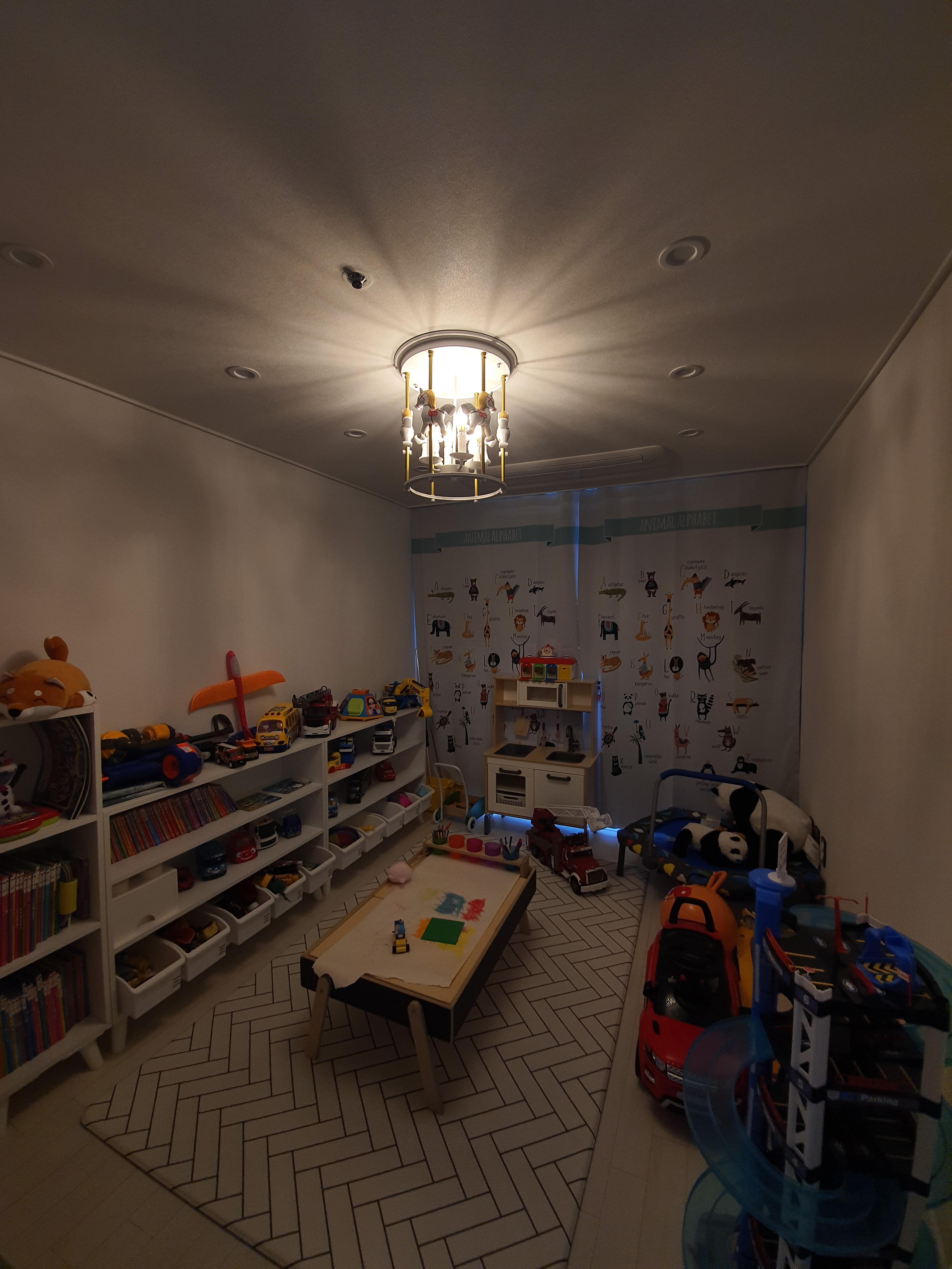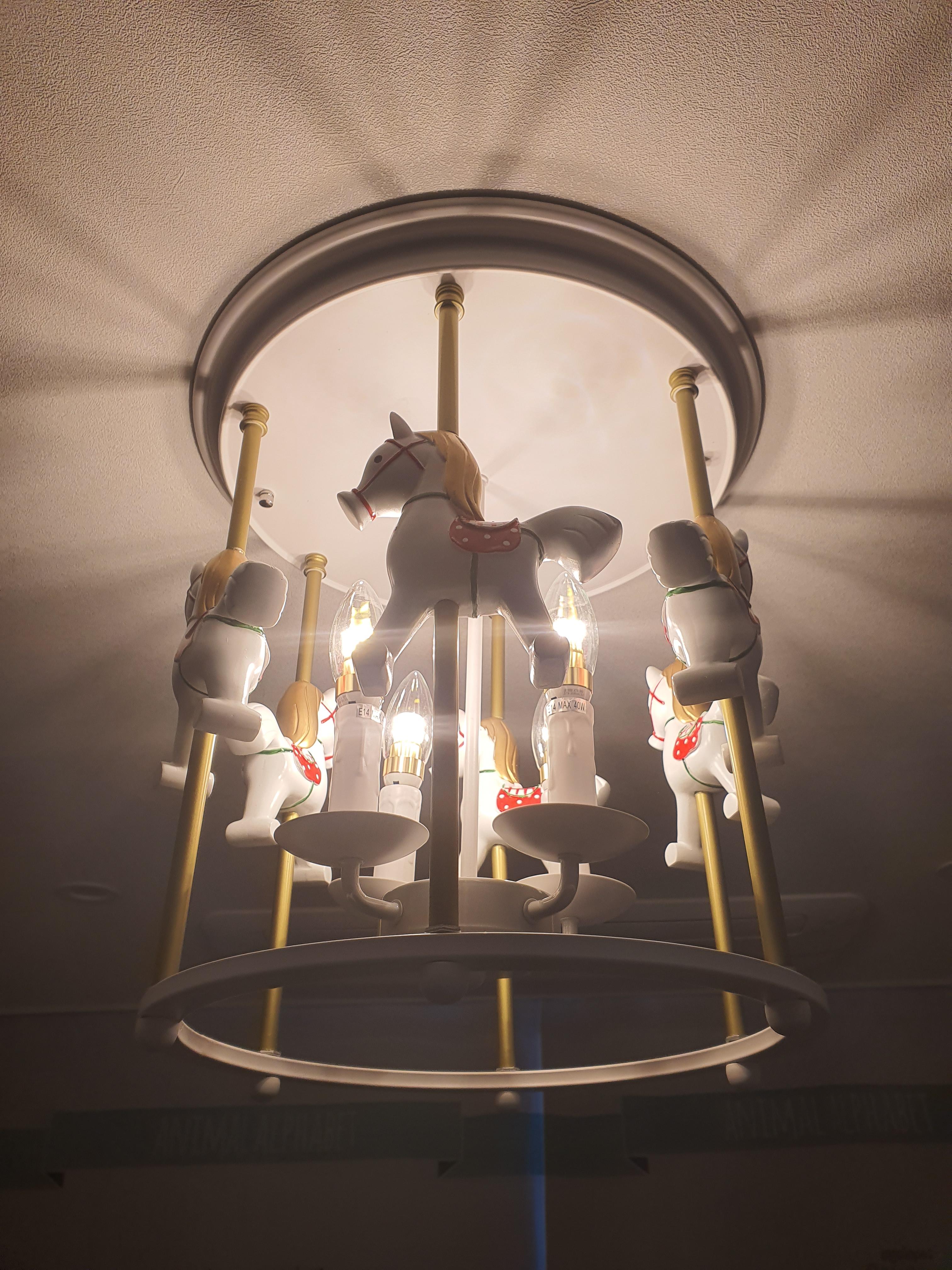 우연히 sns 에서 발견한 회전목마 조명을보니 흔하지않고 5세 아이방에 설치하기에 빛이 상들리에처럼 하부를 향하지 않아 조형물과 벽을 이용한 간접조명의 효과도 있을것같아 선택하였다 굳이 긍정회로를 돌려보자면 빛을 직접 바라보지 않으니 아이의 시력보호에도 도움이 되리라 사진처럼 빛 이 조형물의 그림자와 함께 천장에 퍼지는데 생각보다 이쁘다 아이방 조명으로 아주 만족스럽다