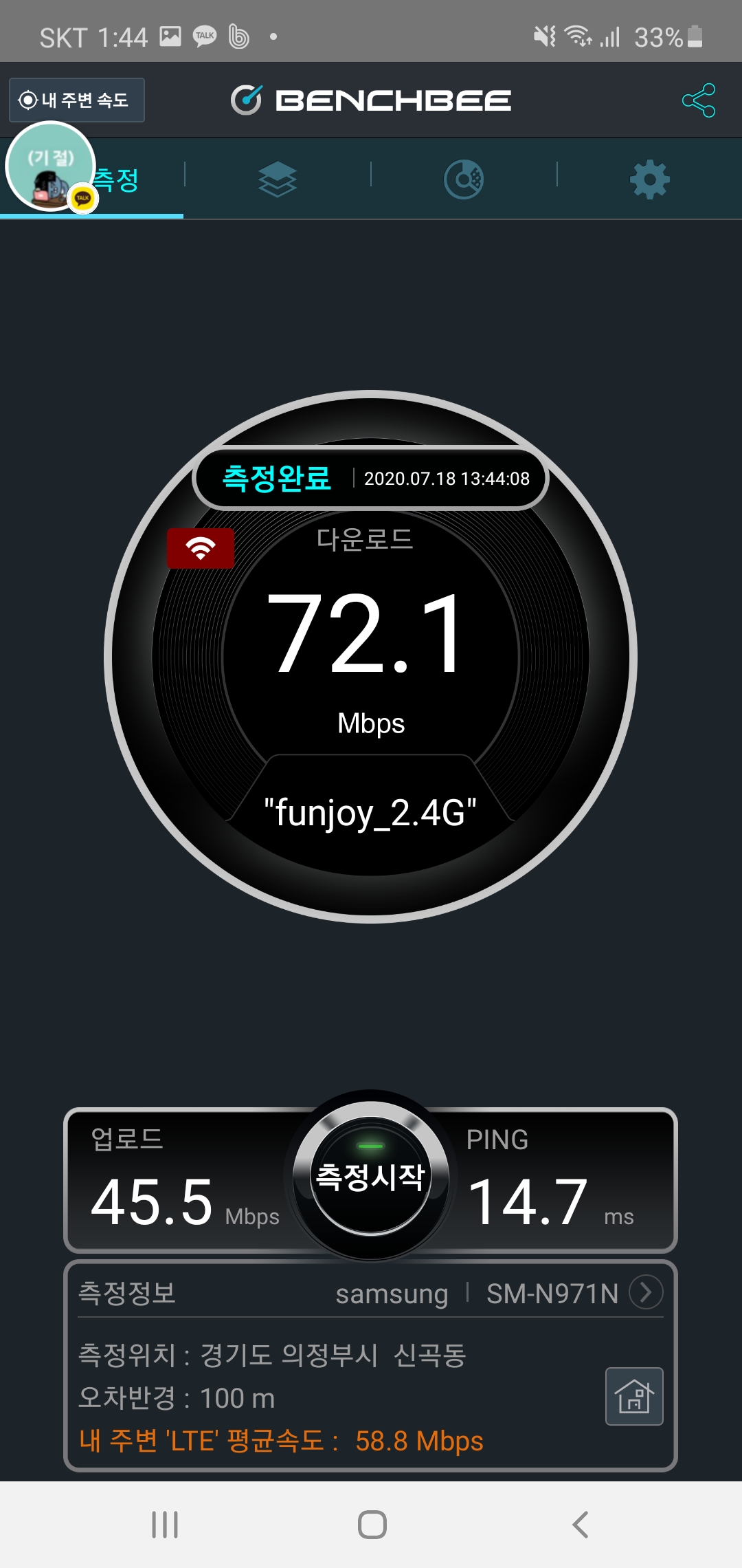 2.4g 는 다운로드는 별 차이가 없었는데 업로드속도가 오히려 45.5mbps 로 더 떨어졌다 이부분은 설치환경상의 문제일수 있기에 나중에 몇차례 더 테스트 후 공유기의 위치를 변경해볼 필요가 있겠다 보통은 무조건 통신사에서 제공하는 공유기보다 신호가 빠르고 넓어야함이 당연하기때문에 설정에 변화를 주면될듯하다