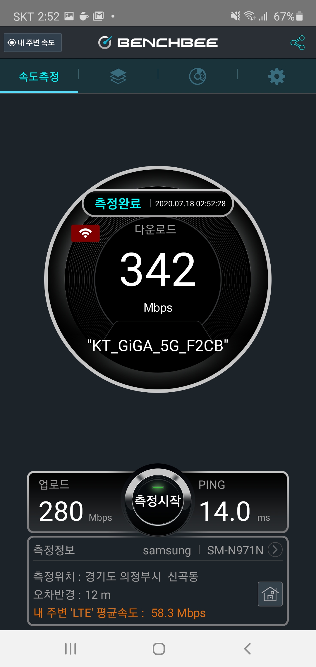 벤치비를 이용하여 기존 kt 기가인터넷 공유기 의 속도를 측정시 2.4g 는 다운로드기준 77.6 mbps / 5g 는 다운로드기준 342 mbps 가 나왔는데 (우리집은 제법 인터넷이 빠르편임)