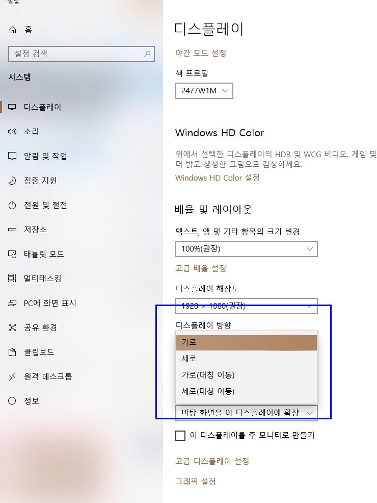 혹 모니터를 가로가 아닌 세로로 사용하고자 한다면 (기사를 읽거나 아래로 길게 스크롤을 내려야하는 작업에 유리함) 디스플레이 방향 설정에서 가로를 세로 또는 세로(대칭이동) 을 선택해주면 된다