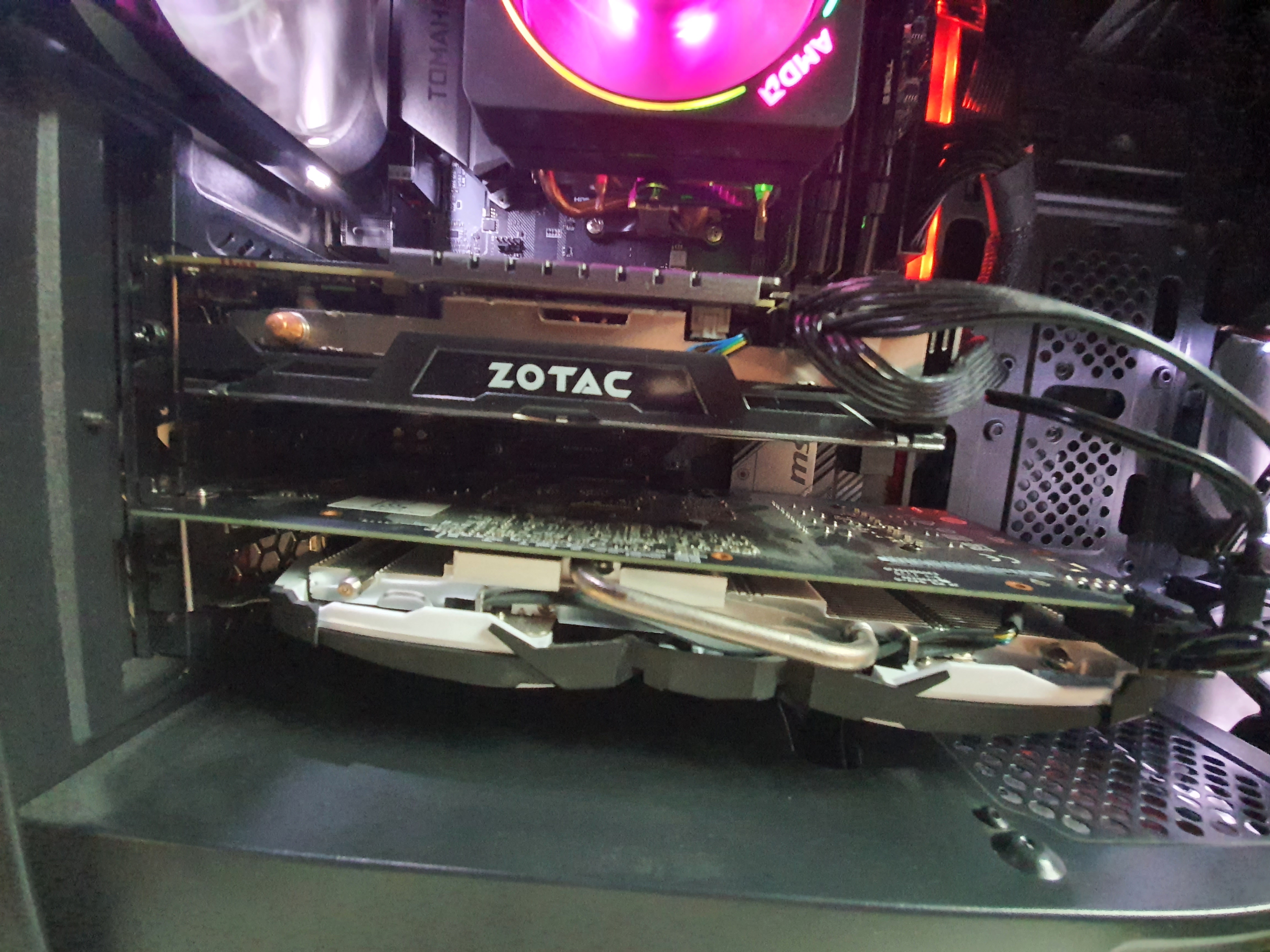 어쨌든 사진처럼 그래픽카드를 위아래로 배치하여 케이블을 연결해주고 윈도우에서 디스플레이 설정만 해주면 끝이다
