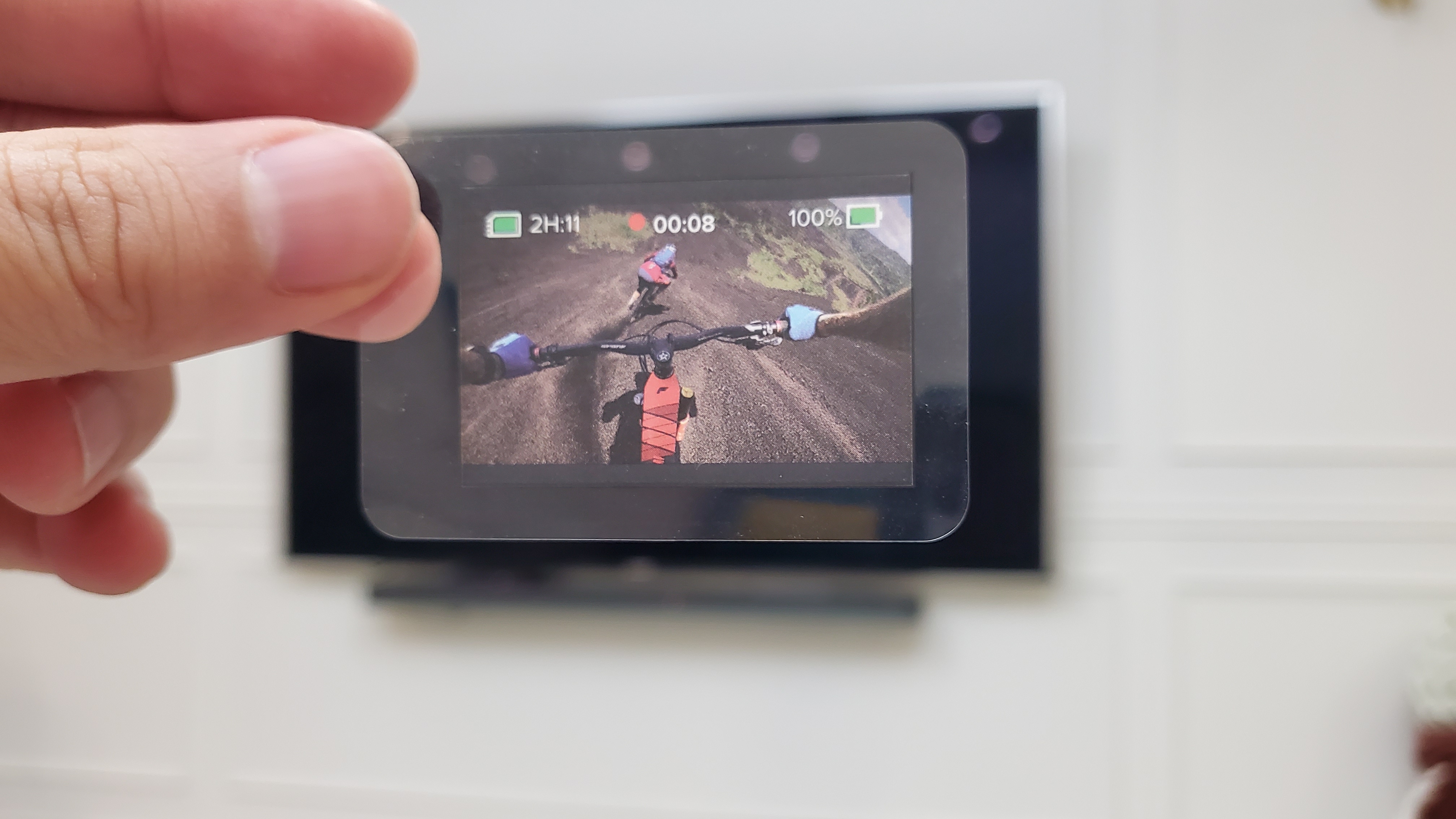 헬멧캠은 생각보다 윗쪽을 바라보게 셋팅해야한다 (사진은 너무 아래를 바라보고 있다) 라이더는 최대한 몸을 숙이며 머리를 숙이기에 카메라는 생각한것보다 더 윗쪽을 바라보아야 우리가 생각하는 화면을 촬영할 수 있다