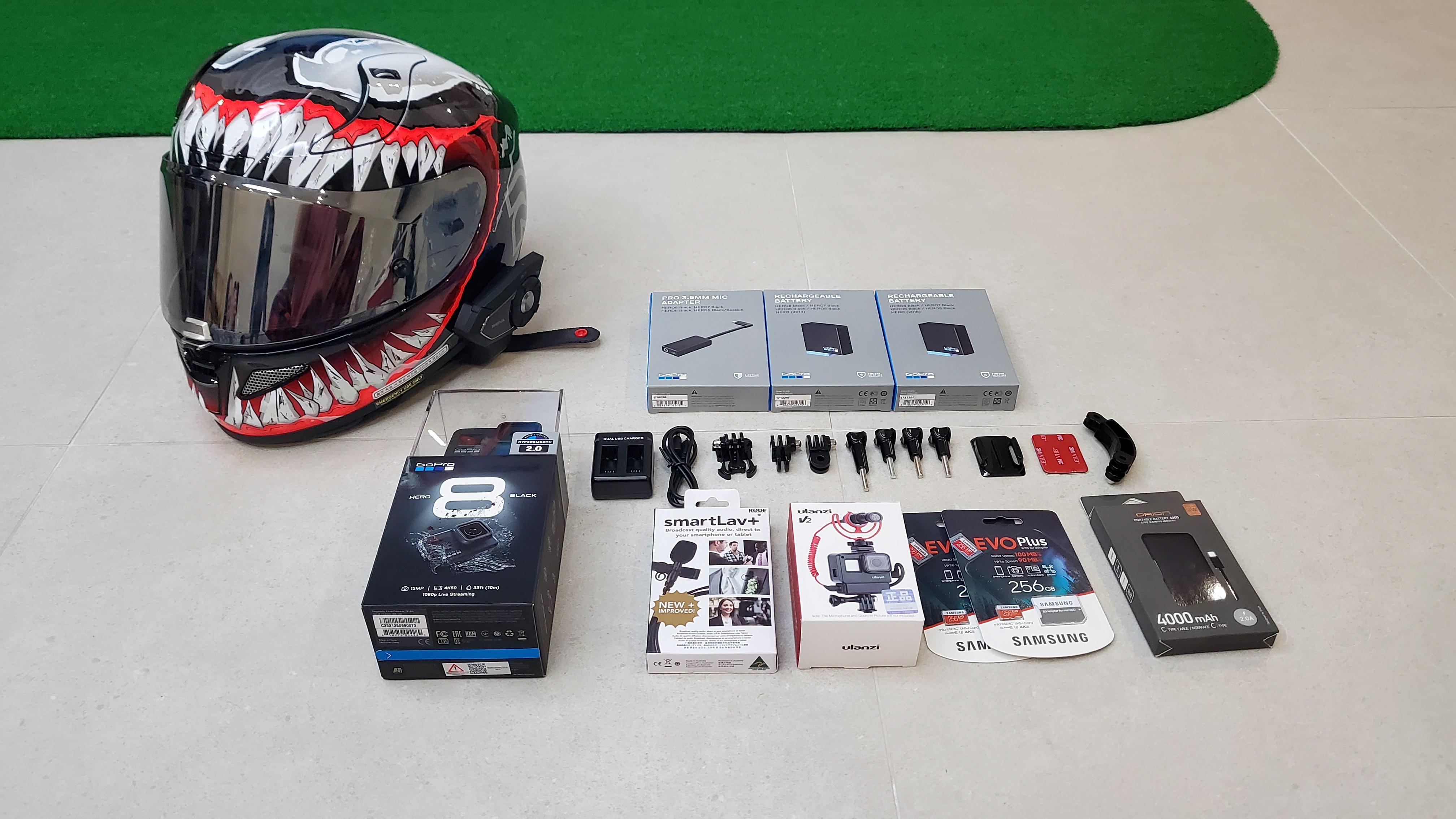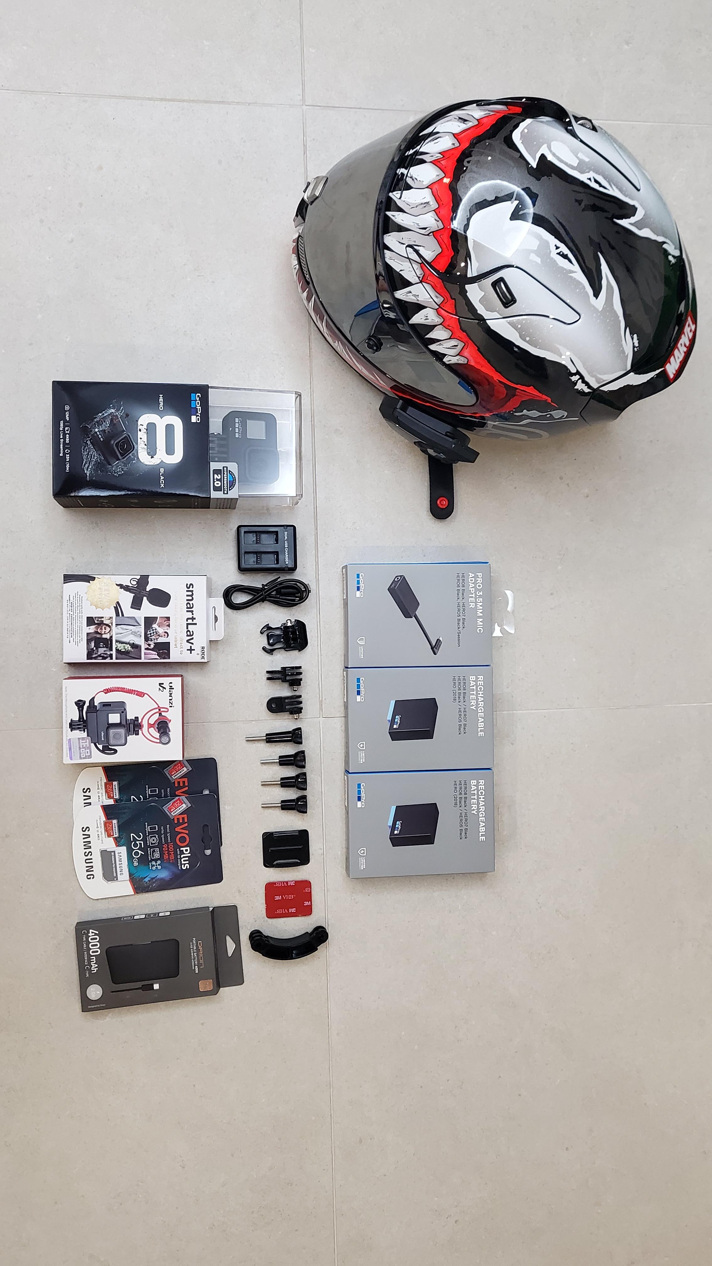 먼저 사진에서처럼 헬멧캠을 구성하기위해서는 제법 비용이 발생한다 홍진 알파11 베놈2 헬멧을 제외하고 대략 60만원정도의 비용이 소요되었다 구성품에 대한 자세한 설명은 하단에서 계속하겠다