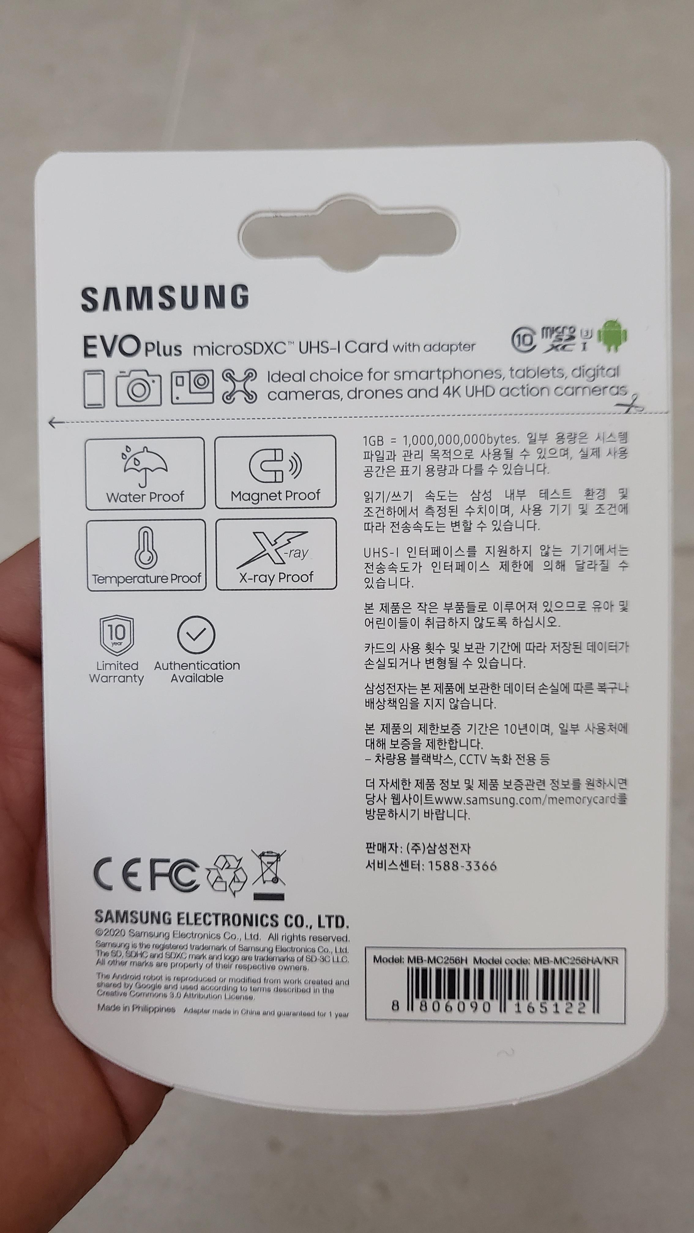메모리카드 또한 신뢰도 및 오류율이 낮은것을 최우선으로 삼성 256gb 에보플러스 마이크로메모리 카드를 구입하였다 클래스10 의 4K 를 지원하는 메모리카드로 고프로에서 4K 영상을 저장하기에 부족함이 없다